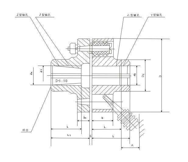 HTL彈性聯(lián)軸器屬于非金屬?gòu)椥栽闲赃B軸器,其結(jié)構(gòu)上與凸緣聯(lián)軸器很相似,但是兩個(gè)半連軸器的聯(lián)接不用螺栓而用帶橡膠或皮革套的柱銷,以實(shí)現(xiàn)兩半聯(lián)軸節(jié)的聯(lián)接。彈性套柱銷聯(lián)軸器曾經(jīng)是我國(guó)應(yīng)用廣泛的水泵聯(lián)軸器,早在 20 世紀(jì)50 年代末期即已制訂為機(jī)械部標(biāo)準(zhǔn), JB08 — 60 彈性套柱銷聯(lián)軸器,是我國(guó)一個(gè)部標(biāo)準(zhǔn)。為了更換柱銷套時(shí)簡(jiǎn)便而不拆移機(jī)器,設(shè)計(jì)中應(yīng)注意留出距離A;為了補(bǔ)償軸向位移,安裝時(shí)應(yīng)注意留出響應(yīng)大小的間隙c 。